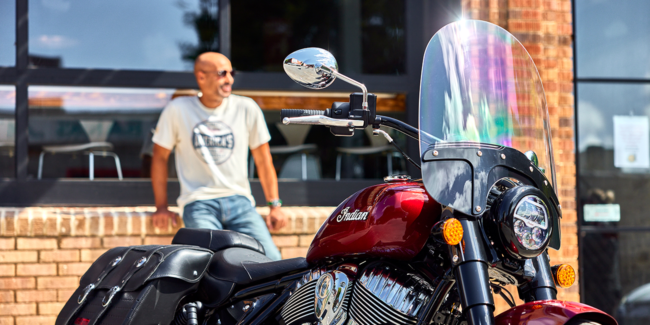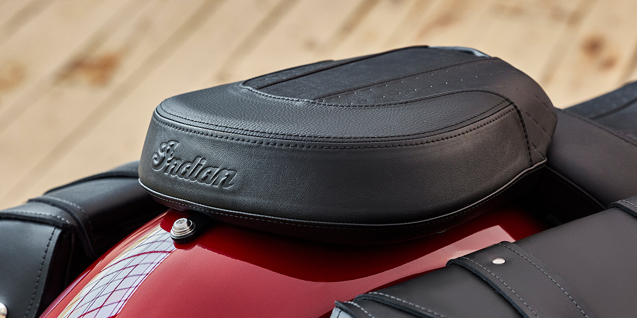 Högkvalitativa kromdetaljer, gaffelskydd, trådekerfälgar, en stor strålkastarnacelle och den ikoniska Indian-logon på tanken.