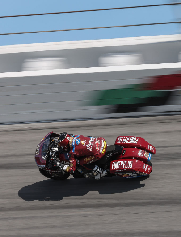 In 1909, we won the first motorcycle race ever held at Indianapolis Motor Speedway. In 1937, Ed Kretz took the first Daytona 200 on an Indian Sport Scout. The original Wrecking Crew owned the post-war racing scene. We continued that tradition with Flat Tracking Racing in the 2010s. Today's riders are doing the same at the Bagger Racing League Europe and the MotoAmerica King of The Baggers series. Different eras. Same result.